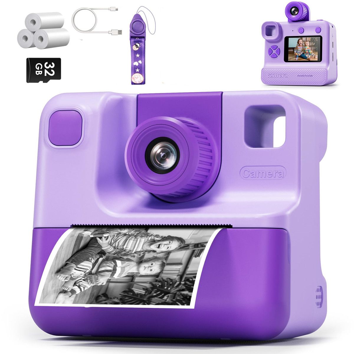 1080P Instant Print Camera for Kids,HD Digital Video Cameras with 3 Rolls Print Paper & 32G Card for Christams Gifts-Purple