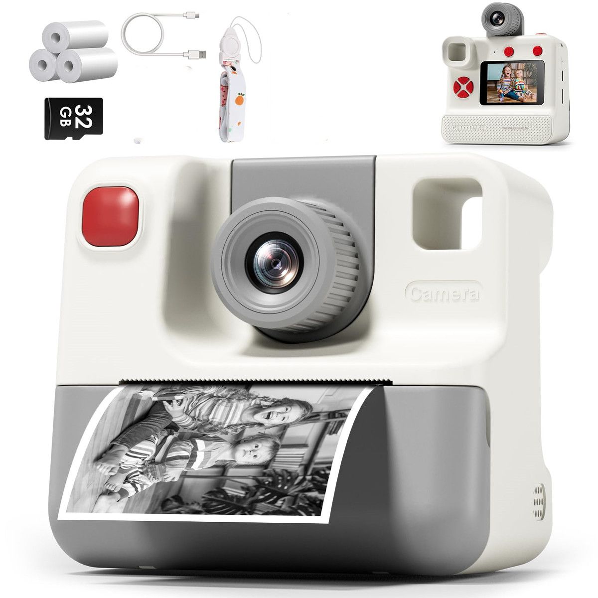 1080P Instant Print Camera for Kids,HD Digital Video Cameras with 3 Rolls Print Paper & 32G Card for Christams Gifts-White