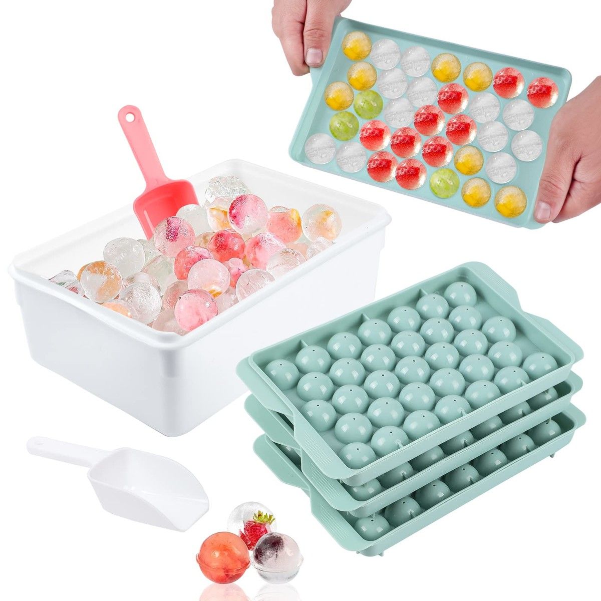3pc Round Ice Cube Tray with Coolbox, Ice Cube Trays in Mini Ball, Ice Ball for Freezer, 3 x 99 Ice Cube Cocktail, Adapted Whisky ( Ice Cube*3 + box+ Shovel)