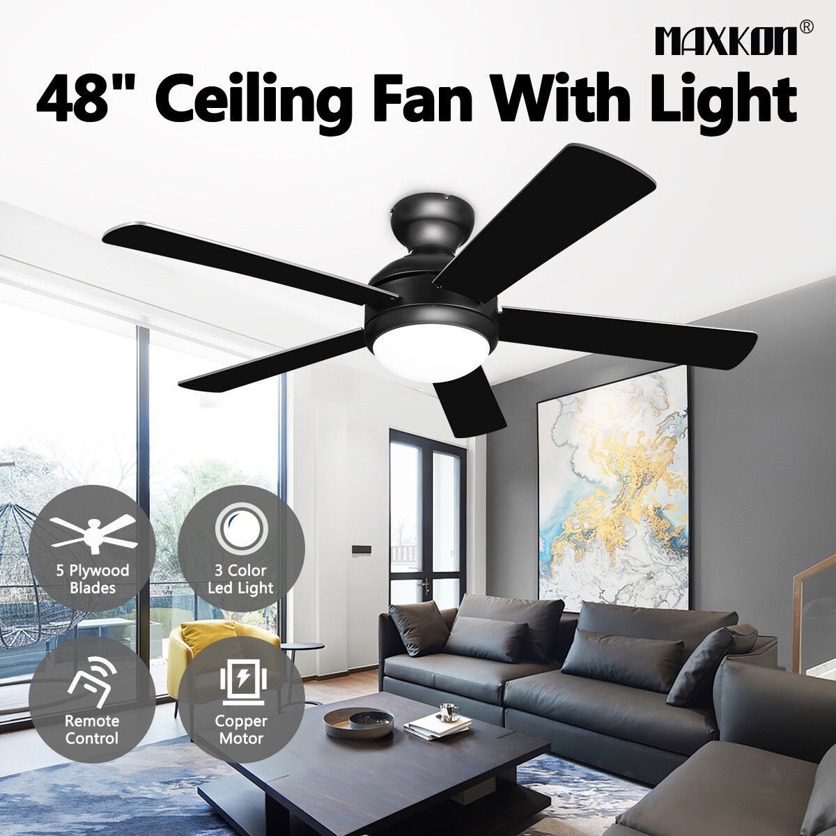 48 Inch Ceiling Fan with LED Lights Remote Control Electric Cooling 5 Blades 3 Speed Timer Black and walnut