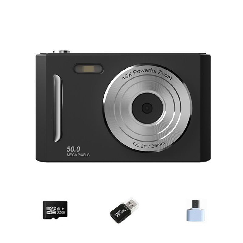 Black Student Digital Camera HD DualLens 50MP 8x Zoom Beauty Filter FrontBack Cameras 32G Memory Card