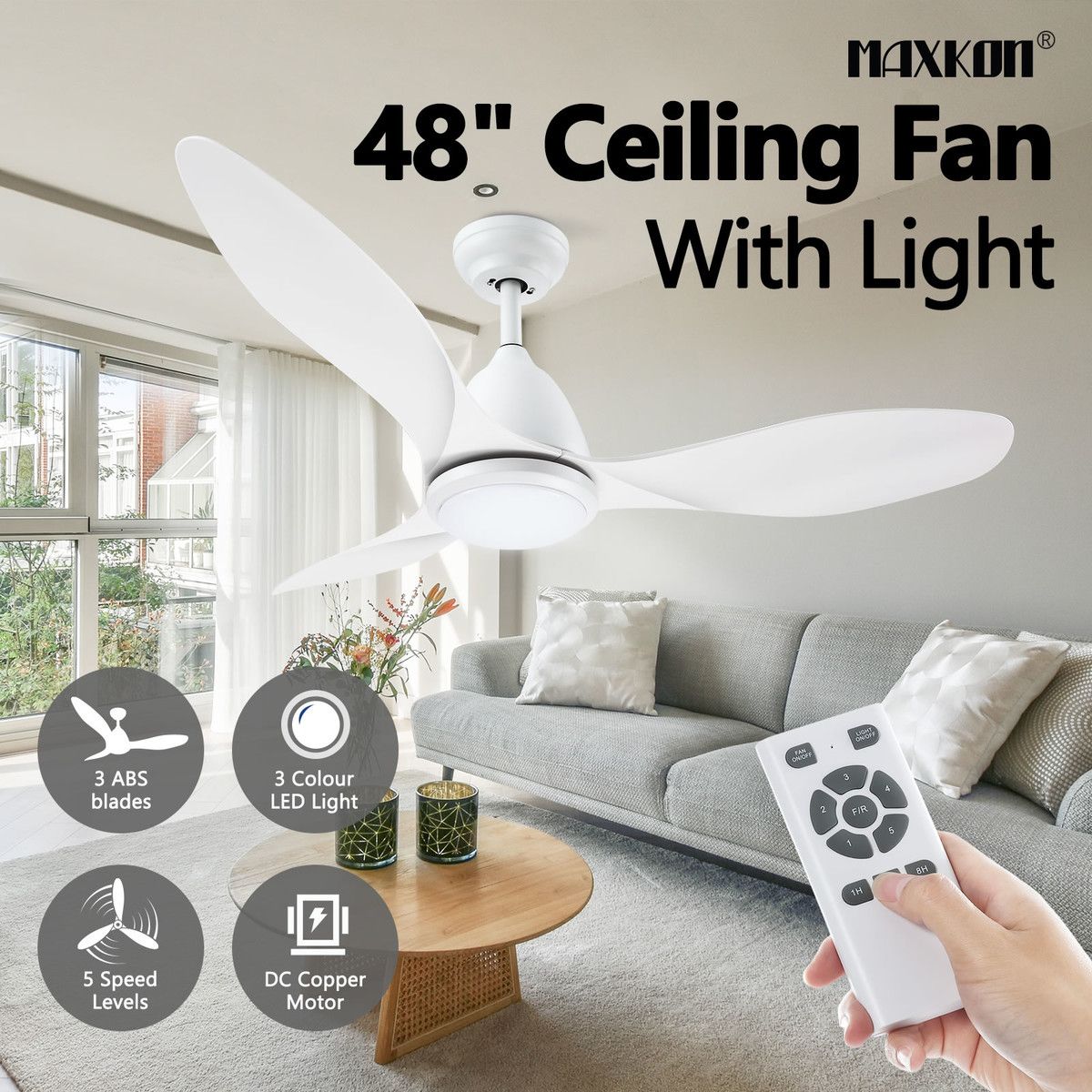 Ceiling Overhead Fan with Light Remote Control Cooling Air Ventilation LED Lamp Quiet Electric White Modern Indoor 3 ABS Blades 5 Speed Timer 122cm