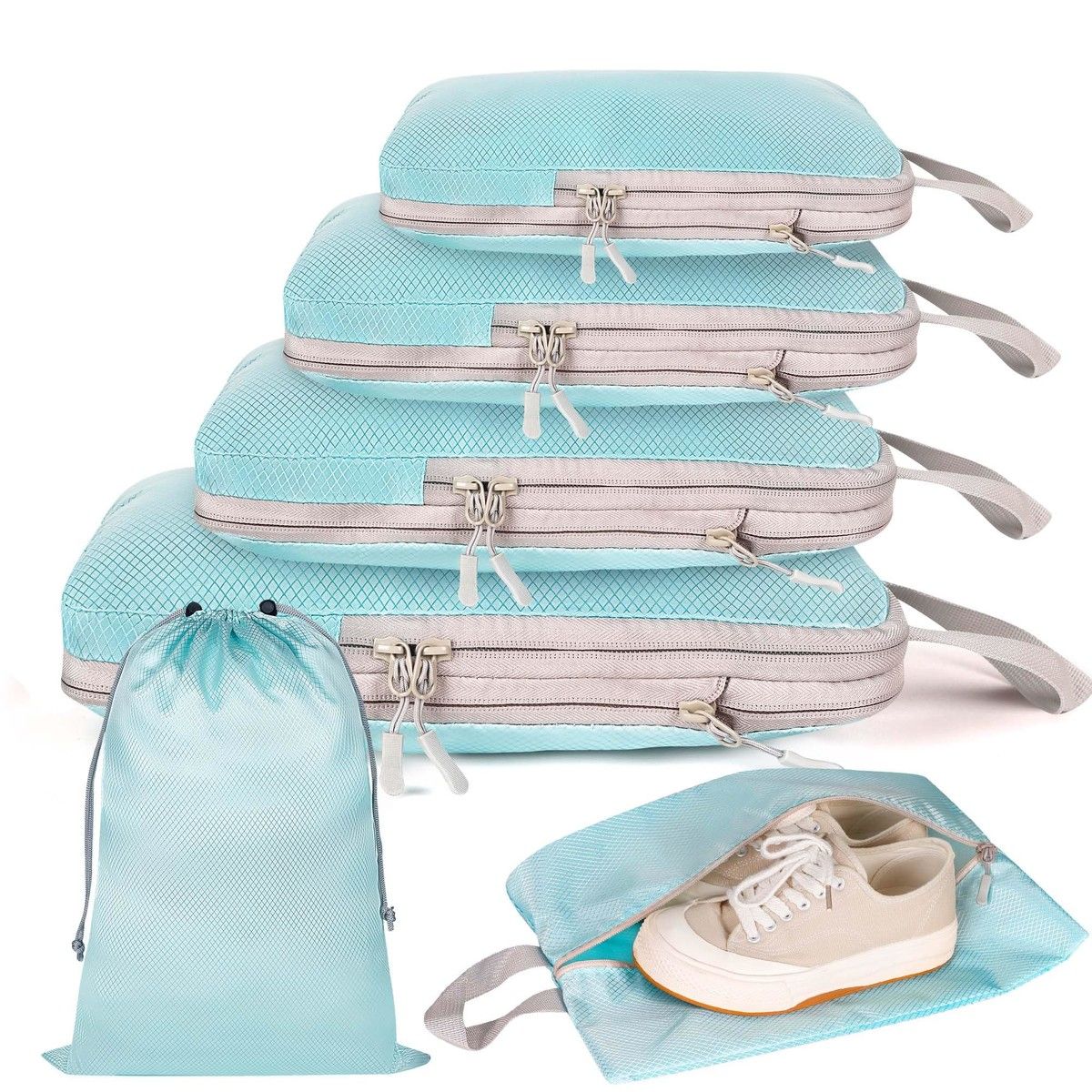 Compression Packing Cubes for Suitcases 6 Set, Expandable Travel Suitcase Organizer Bags Set with Shoe Bag, Lightweight Luggage Packing Organizers(Luke Blue)