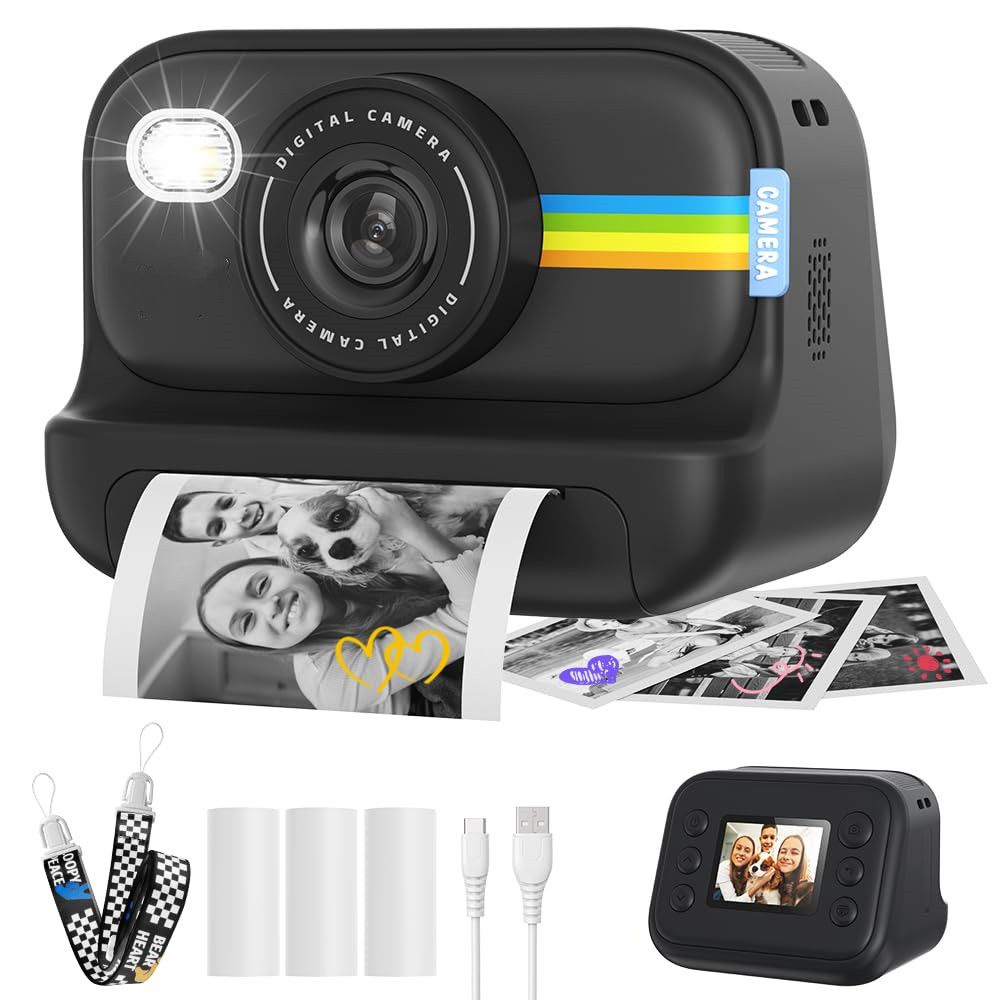 Instant Print Camera for Kids 1080P Video Birthday Gifts for Girls Boys Ages 3-12 Christmas Holiday Ideas(Black)