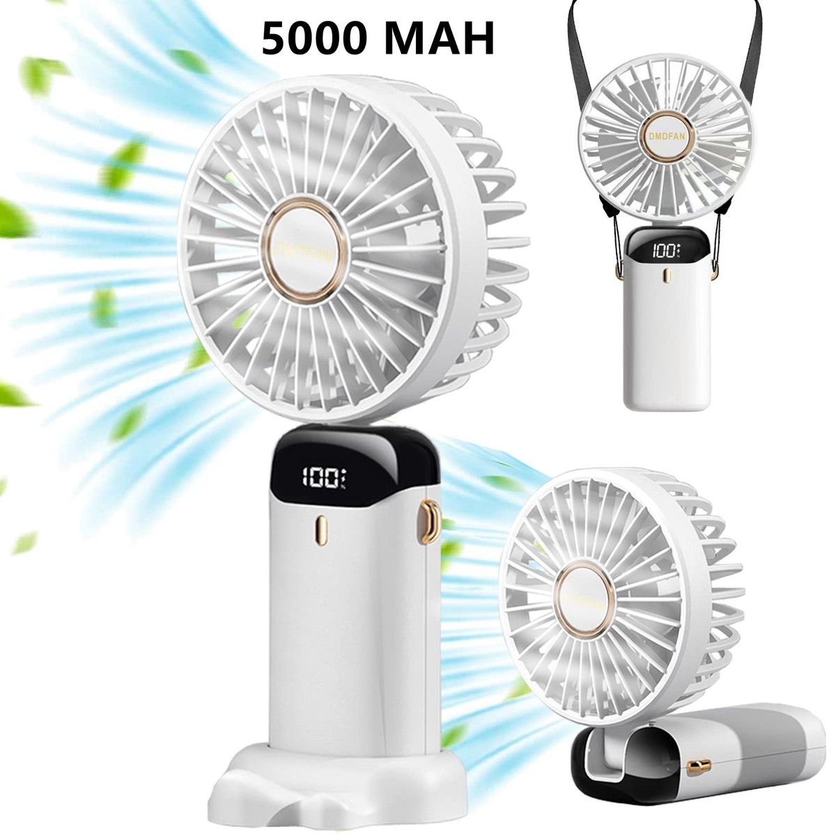 Mini Handheld Portable Hanging Neck Fan Adjustable USB Rechargeable with 5 Speed for Home Office Travel (5000mAh-White)
