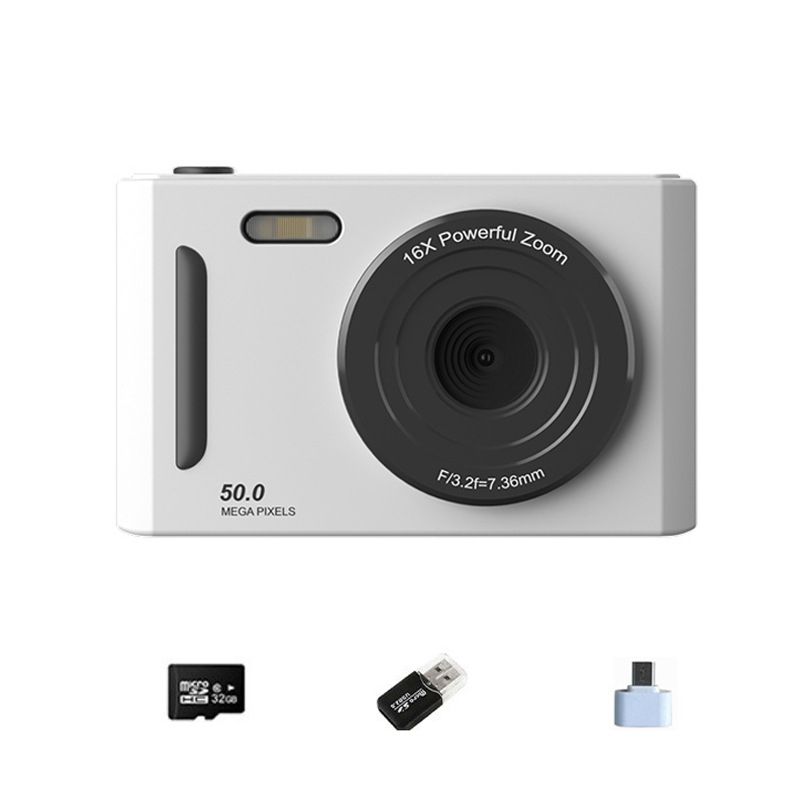 White Student Digital Camera HD DualLens 50MP 8x Zoom Beauty Filter FrontBack Cameras 32G Memory Card